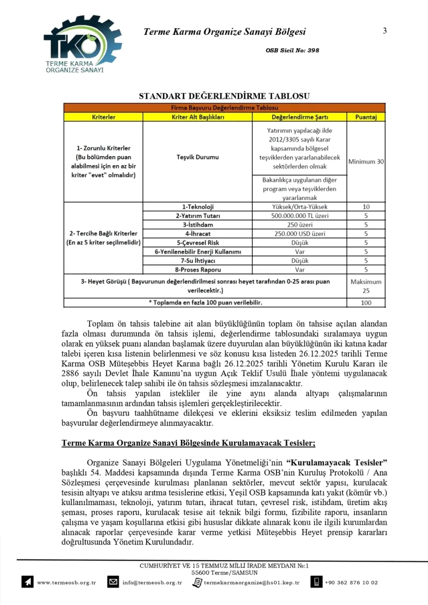 Başvuruların değerlendirilmesinde standart puanlama tablosunun esas alınacağı belirtilirken, kriterlerin ve ağırlık oranlarının OSB’ye göre değişiklik gösterebileceği kaydedildi. Açıklamada, toplam talebin arz edilen alanı aşması durumunda en yüksek puanı alan başvurulardan başlanarak kısa liste oluşturulacağı ifade edildi.