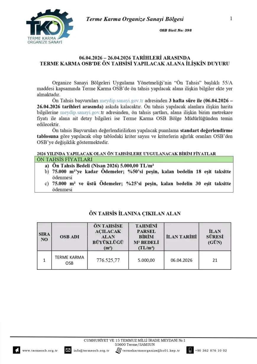Terme Karma OSB’de 2026 yılı için uygulanacak ön tahsis bedelinin metrekare başına 5.000 TL olduğu bildirildi. Yapılan duyuruda ödeme planına ilişkin şu bilgilere yer verildi: