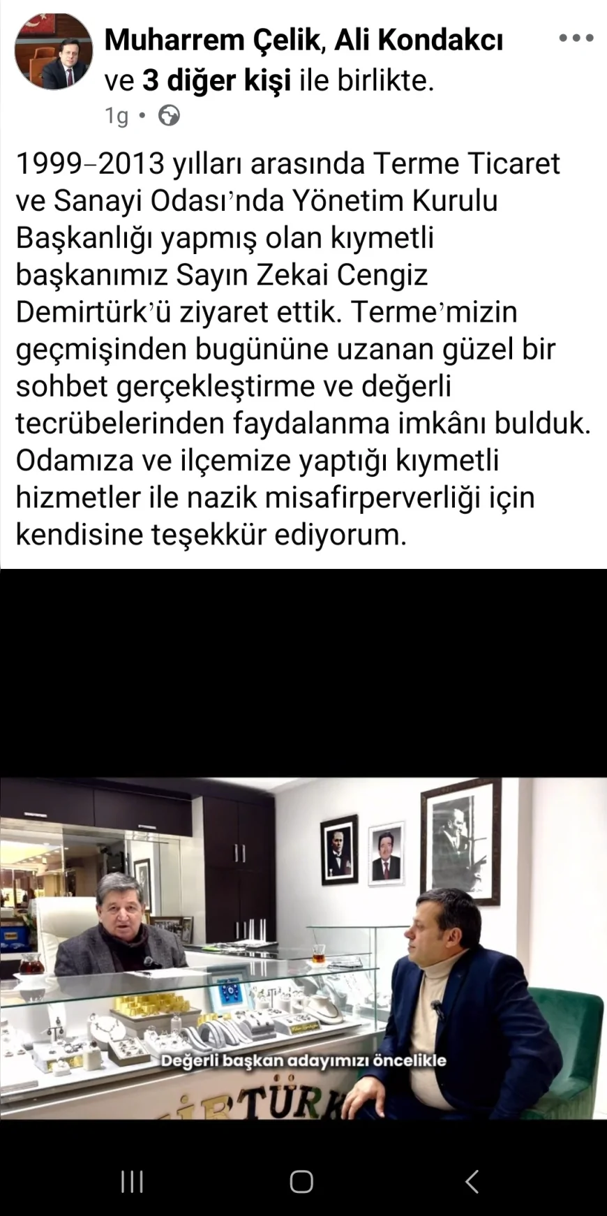 Terme Ticaret ve Sanayi Odası Başkan Adayı Muharrem Çelik, oda yönetiminde geçmiş dönemlerde görev yapmış isimlere ziyaretlerde bulundu. Çelik, 1999–2013 yılları arasında Terme Ticaret ve Sanayi Odası Yönetim Kurulu Başkanlığı görevini yürüten Zekai Cengiz Demirtürk ile bir araya geldi.