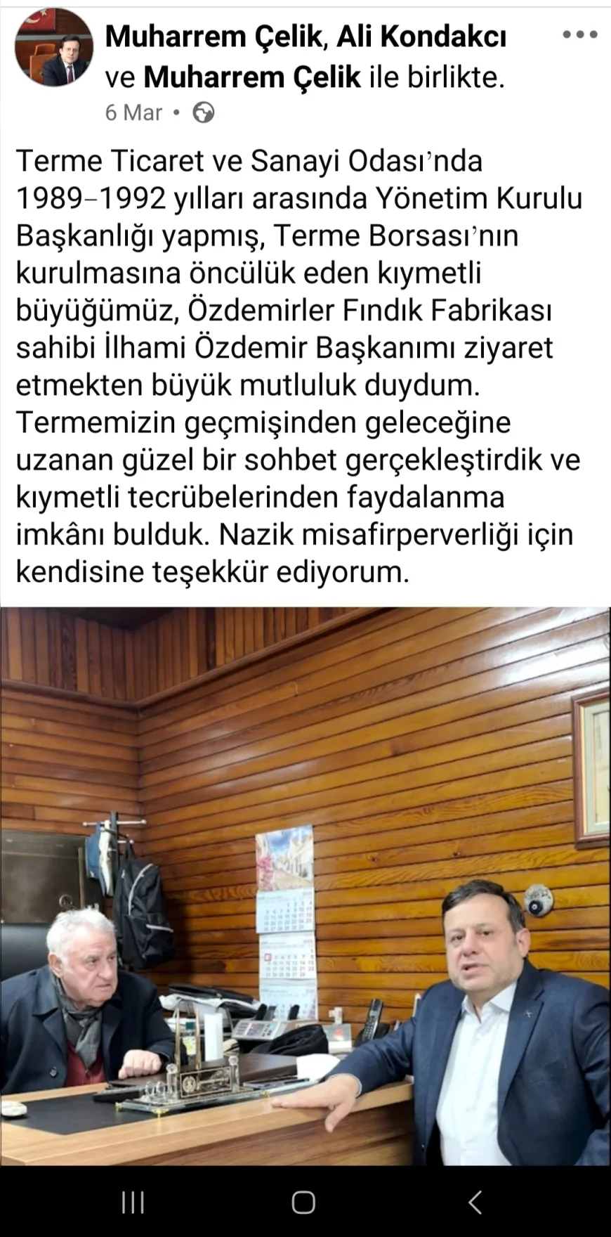 Ziyaretten duyduğu memnuniyeti dile getiren Çelik, “Terme Ticaret ve Sanayi Odası’nda 1989–1992 yılları arasında Yönetim Kurulu Başkanlığı yapmış, Terme Borsası’nın kurulmasına öncülük eden kıymetli büyüğümüz, Özdemirler Fındık Fabrikası sahibi İlhami Özdemir Başkanımı ziyaret etmekten büyük mutluluk duydum. Terme’mizin geçmişinden geleceğine uzanan güzel bir sohbet gerçekleştirdik ve kıymetli tecrübelerinden faydalanma imkânı bulduk. Nazik misafirperverliği için kendisine teşekkür ediyorum.” dedi.