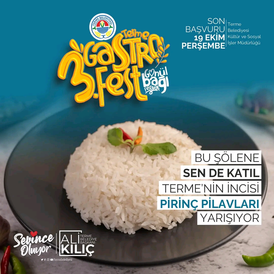 21-22 Ekim tarihlerinde gerçekleşecek olan "3. Terme Gastronomi Gönül Bağı Festivalinde" ilçemizin enfes "Su Börekleri" ve Terme'nin incisi pirinciyle hazırlanacak birbirinden güzel "Pilavları" yarışacak.
