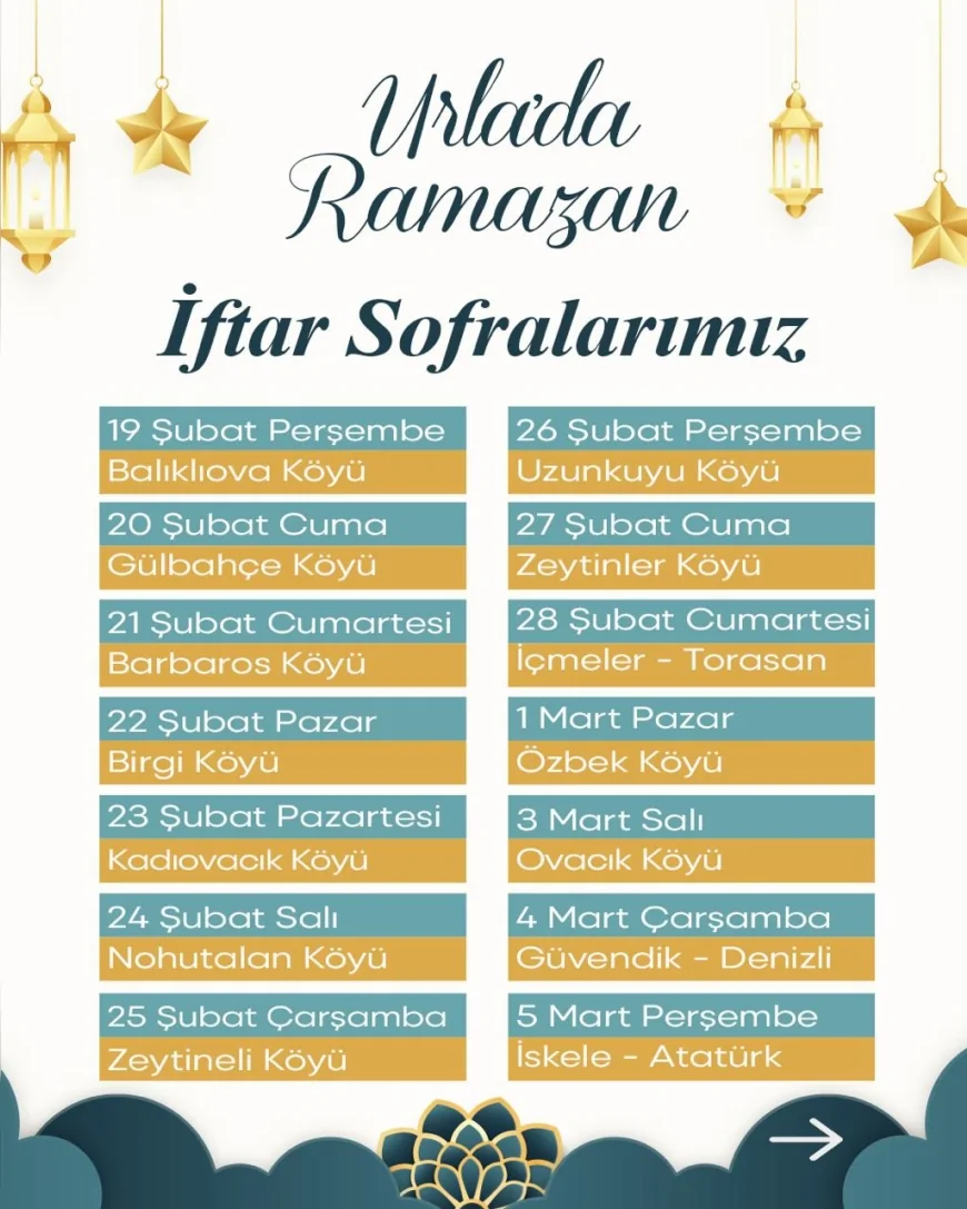 Urla Belediyesi, Ramazan ayının manevi atmosferini ilçe genelinde yaşatmak amacıyla mahalle ve köylerde iftar programları düzenleyecek. Ramazan boyunca farklı noktalarda kurulacak sofralarda vatandaşlar bir araya gelerek aynı sofrayı paylaşacak.