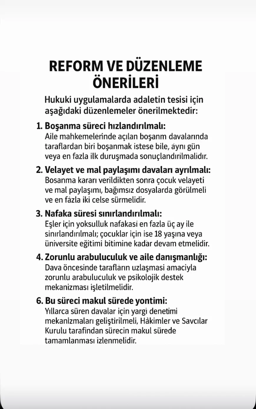 Adaletin temel ilkesi, “geciken adaletin adalet olmamasıdır.”Boşanma davaları yalnızca hukuki bir ihtilaf değil, aynı zamanda toplumun vicdanında yankı bulan bir meseledir. Süresiz nafaka uygulaması ve yıllarca süren davalar, eşitlik ve adalet duygusunu zedelemekte, taraflar arasında derin mağduriyetler doğurmaktadır.