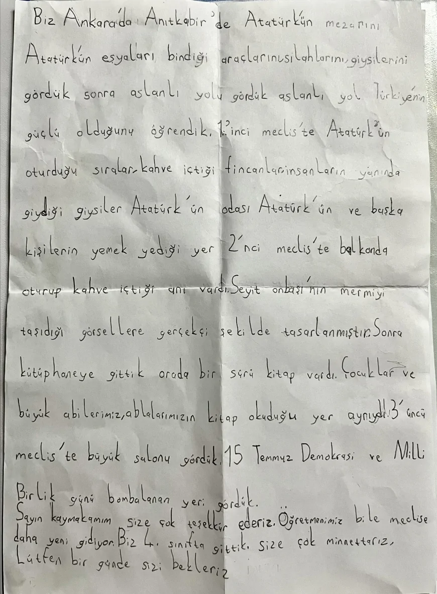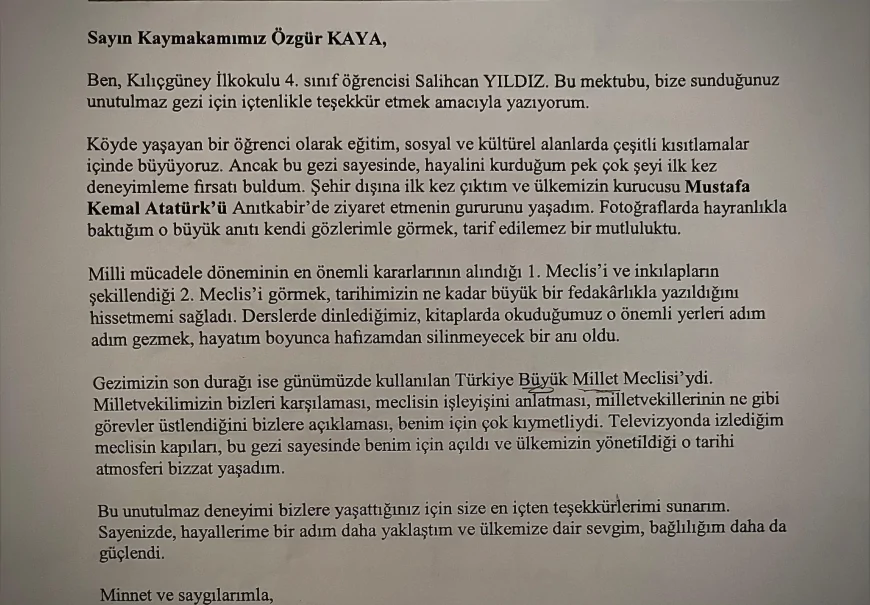 Samsun’un Vezirköprü ilçesine bağlı Kılıçgüney köyünde yaşayan 4. sınıf öğrencisi Salihcan Yıldız, okulunun düzenlediği Ankara gezisinin ardından Kaymakam Özgür Kaya’ya yazdığı mektupta, ilk kez şehir dışına çıkmanın ve Anıtkabir’i ziyaret etmenin kendisi için ne kadar büyük bir anlam taşıdığını duygusal ifadelerle aktardı.