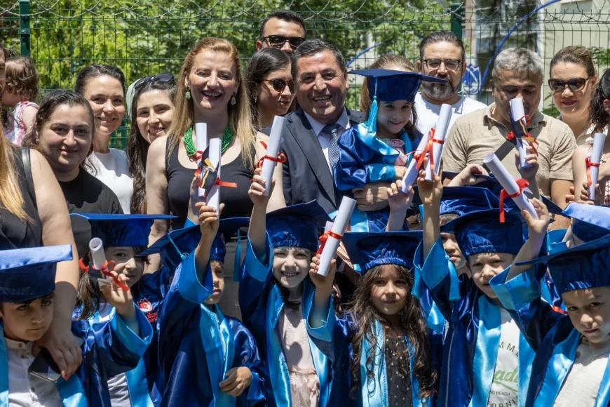 Manisa Yunusemre Belediyesi’ne bağlı Özel Manisa Yunusemre Anaokulu öğrencileri, 2024-2025 eğitim öğretim yılını tamamlayarak mezuniyet coşkusunu danslar, kep atma töreni ve ilk diplomalarıyla kutladı.